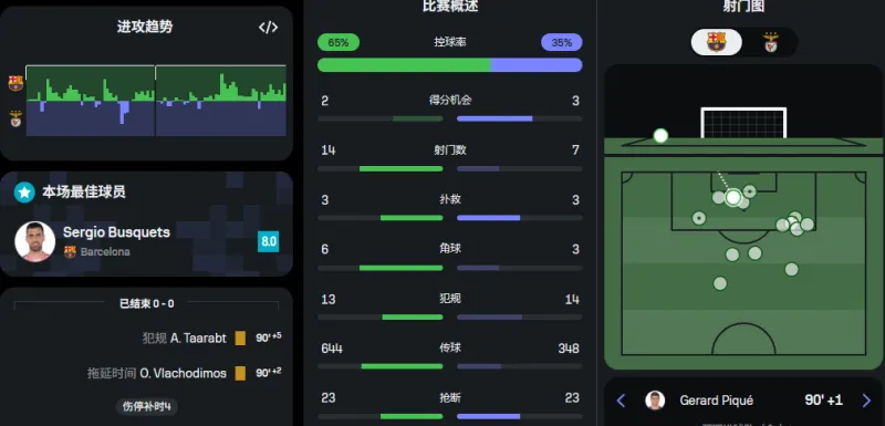 掌控比赛的巴萨士气大伤,丢球后高位压迫造越位被萨内单刀破门,巴萨三分钟连丢2球0比2落后。