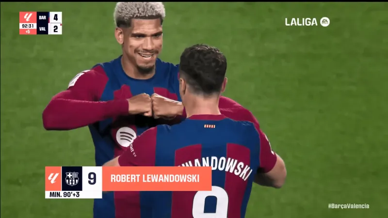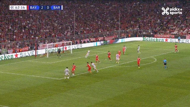 登贝莱突破带球扣倒帕瓦尔(直接因此受伤下场)加维再次吸引防守不停球直塞精准交到一秒后的莱万脚下。莱万停了个跳球,右脚弹射皮球高出。
