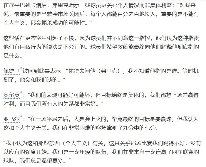 输了塞维利亚弗里克讲的混帐话不少,唯独这段是真畜生话。弗里克口不择言点爆了西班牙更衣室,这次为什么说没有这种感觉了?巴尔德吉两个单刀半单刀不传空位队友,自己强行打门又正又软怎么感觉不到个人主义了?