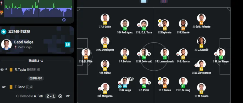 下半场开场佩德里放铲破坏乌帕的直传,分给拉菲尼亚一次很好的机会。拉菲尼亚第三次远射打偏。