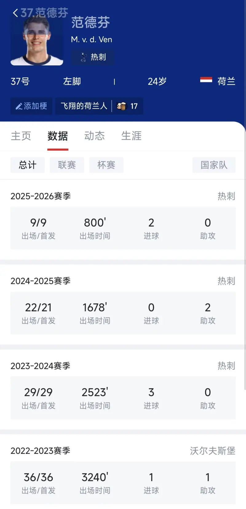 范德芬在狼堡场场首发,所有比赛全部打满,纯铁人,去英超在比赛轮次多好几轮的情况下,去热刺澳波领导下,每赛季打的比赛光联赛就从德甲36掉到29掉到22,这样用下去铁人快变破铜烂铁了,和巴萨看到年轻核心被用伤用成耗材气死一个样,别说热刺核心又贵不想卖根本不交易,现在巴萨没钱,就算买了类似的核心巴萨球迷舍得看到这种情况