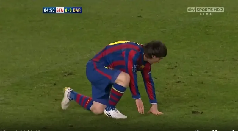 以我踢球的经历来看,梅西高速突入禁区后,为了摆脱防守球员,急停加脚内侧改变球的线路,梅西然后强势快转身,脚快速蹬地,但是皮球在侧后方,强行转身导致身体被别住了,脚发力不足然后滑倒了,或者是因为身体被别住了脚不敢发力顺势倒下避免受伤。