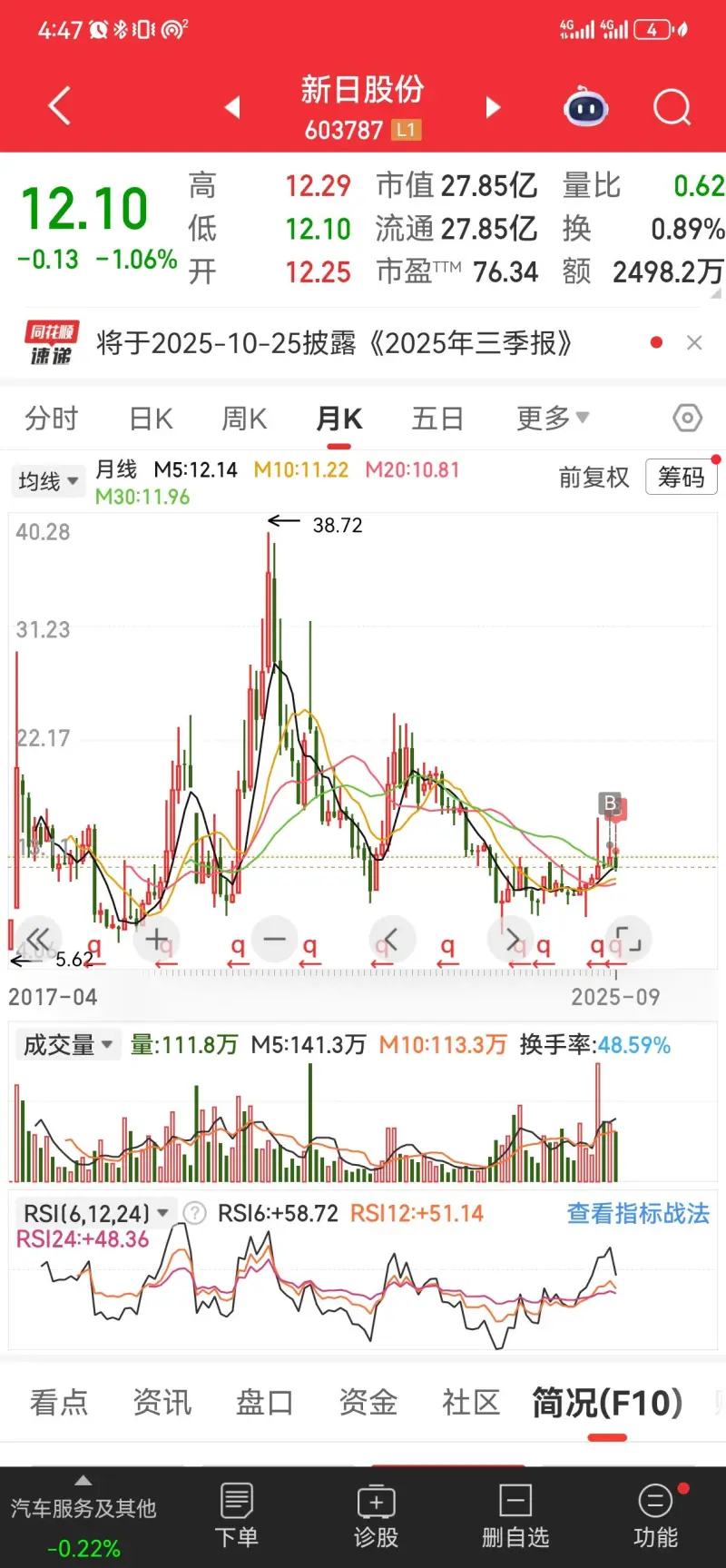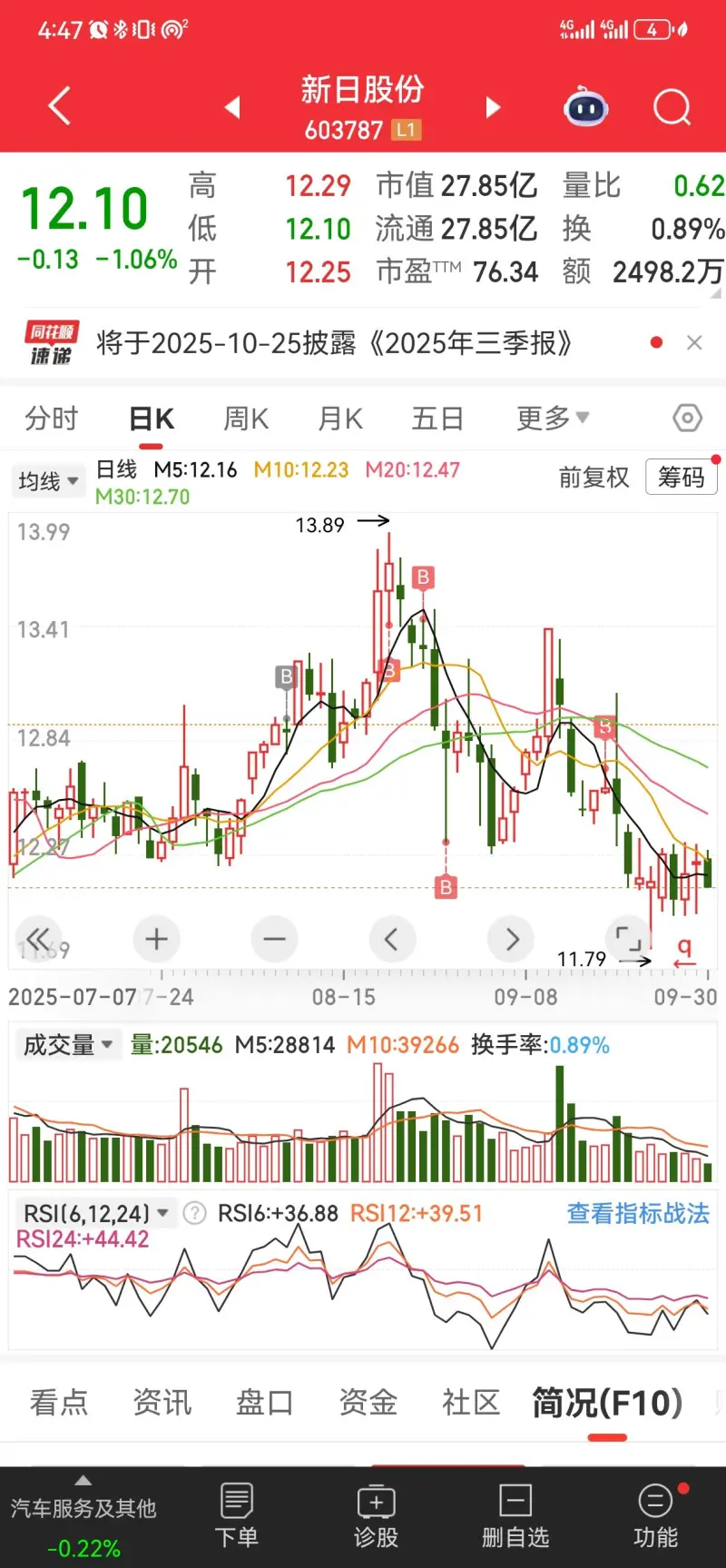 然后三季报10月25号发,也就比较早。因为三季报应该也不错。等吧等反弹看看赚10个点就跑。
