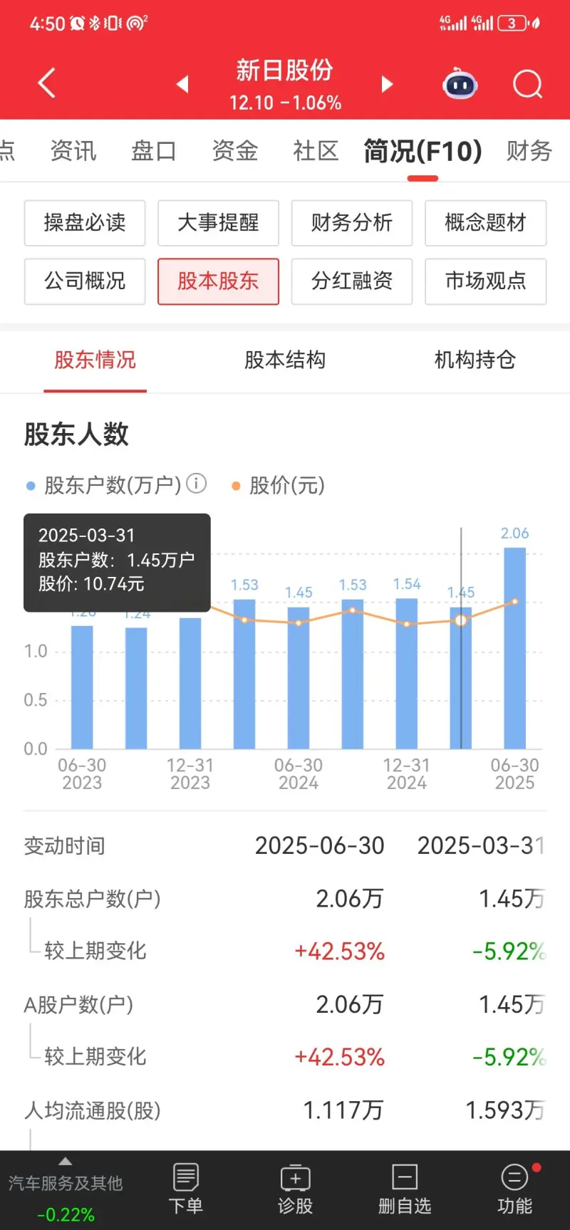 网上有人推荐的。然后一路下跌,一路补仓。买到4万块钱赔了6个点。感觉这股票应该还可以啊,这个这个销售而且利润都双双上升。要是说缺点的话就是股东人数太多了。