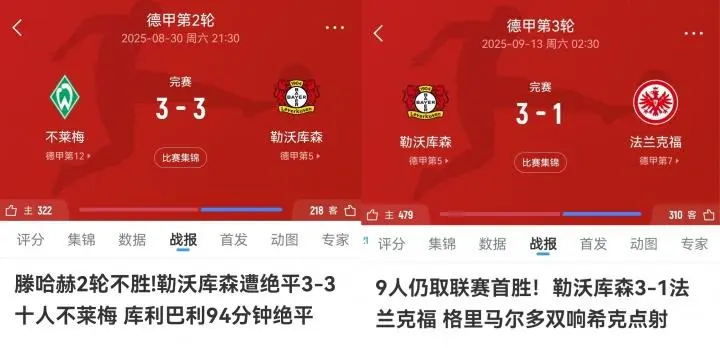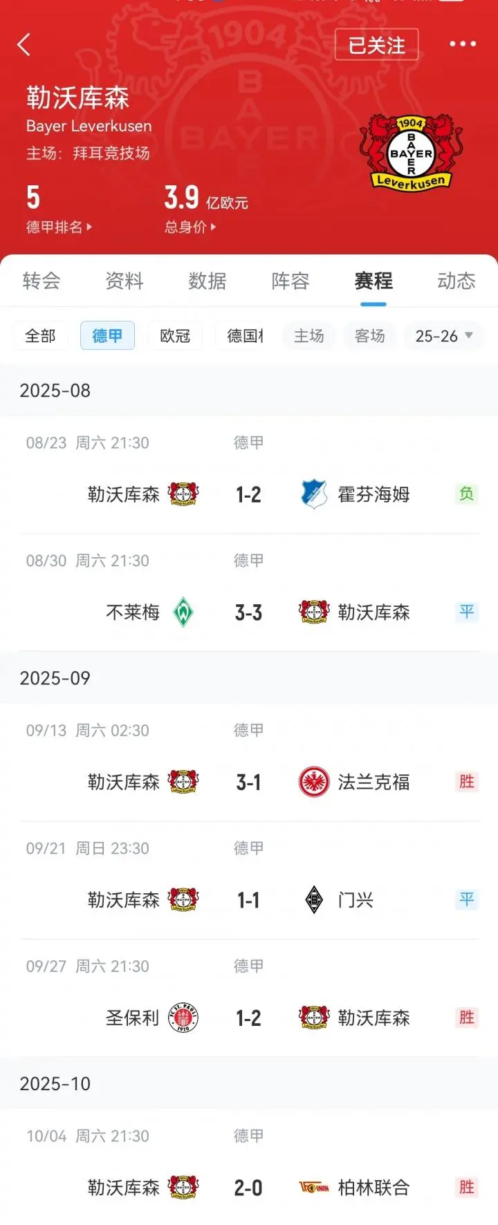10月06日讯 勒沃库森2-0柏林联合,近4轮3胜1平,球队在开局1平1负解雇主帅滕哈赫后,目前已经来到了德甲第五的位置。