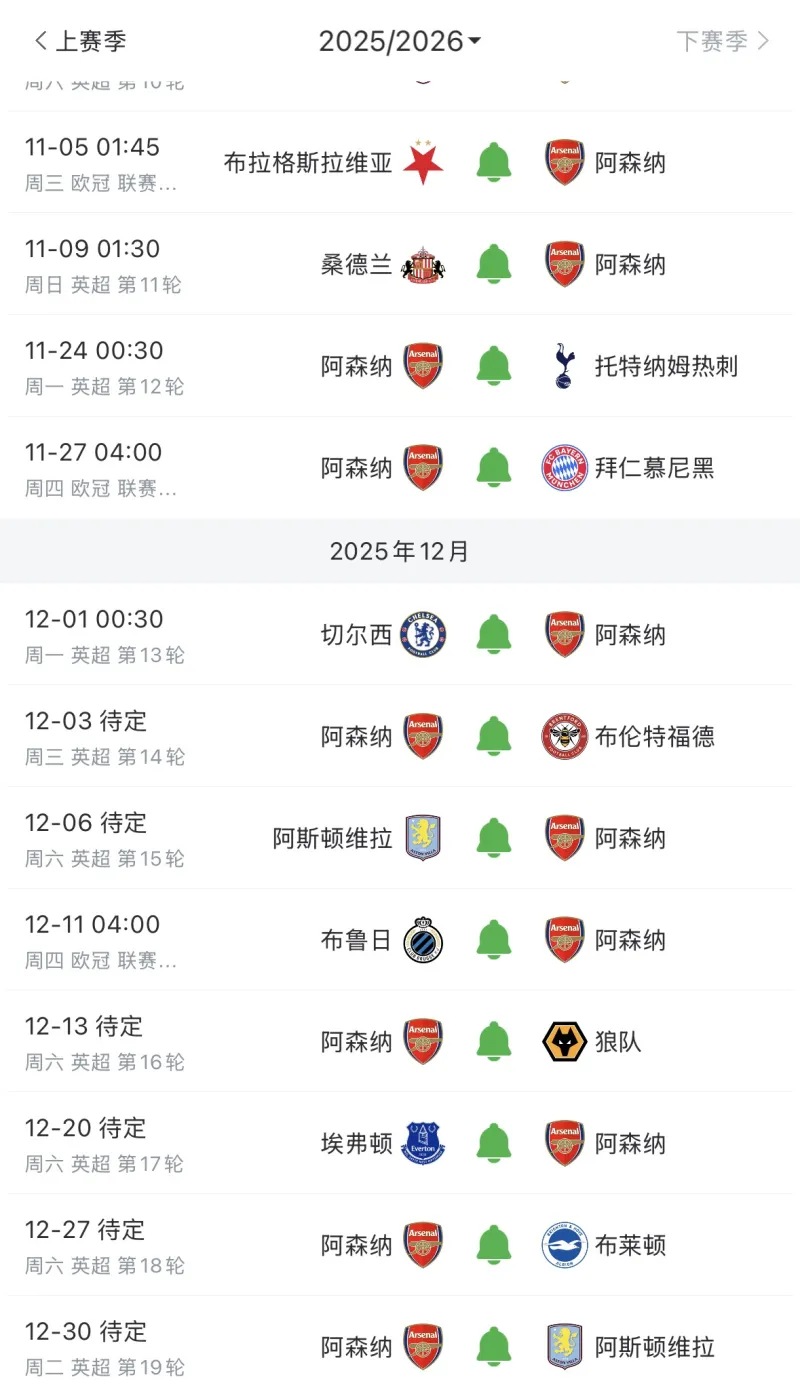 11月国际比赛日后,一直到欧冠小组赛结束,夹杂着英联杯和足总杯,阿森纳将会迎来漫长的一周双赛甚至三赛的赛程。