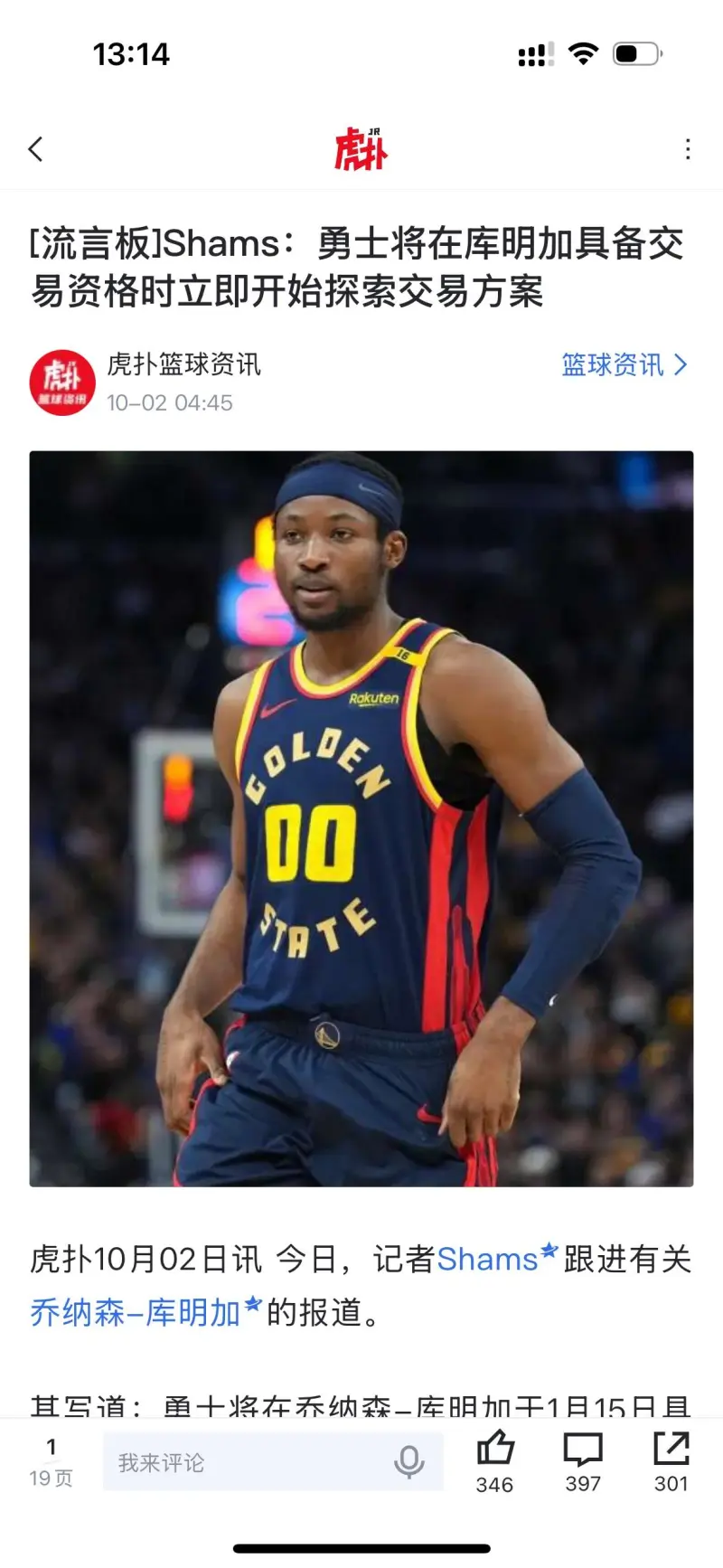 Spears表示,在与金州勇士队签下两年4850万美元的续约合同后,乔纳森-库明加已决心随队冲击总冠军: