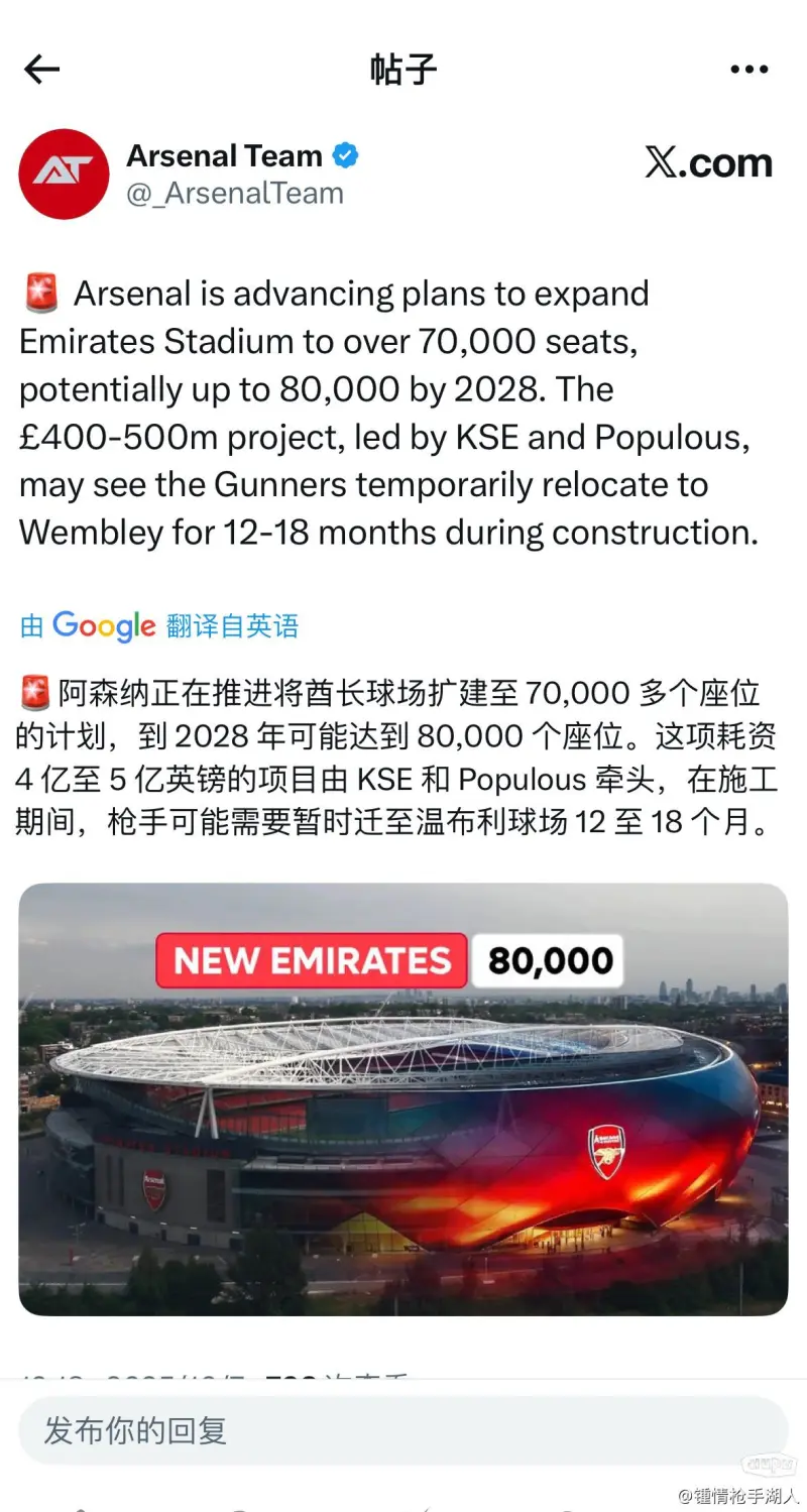 总花费在4-5亿英镑!施工期间阿森纳将会有12-18月时间,短暂使用温布利球场!如果按照计划扩容到8万个座位!那么它将成为全英格兰仅次于温布利球场(可容纳9万人)的第二大球场!