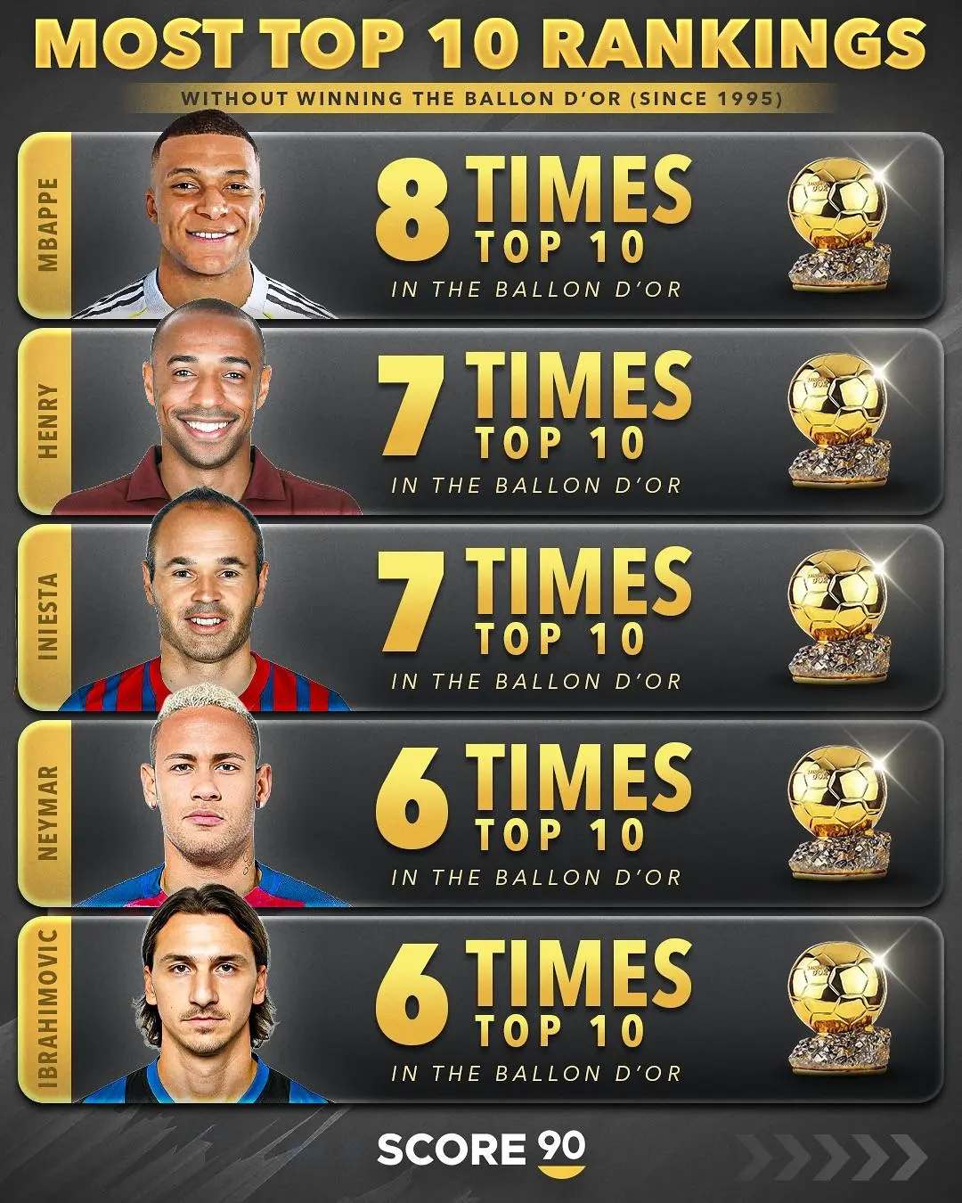 虎扑10月07日讯 Score 90盘点了入围金球奖前十名次数最多但未能获奖的球星,排名前五的球员如下: