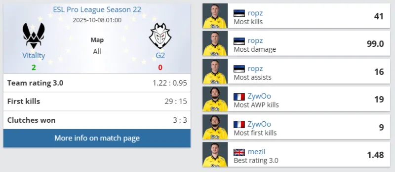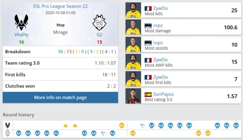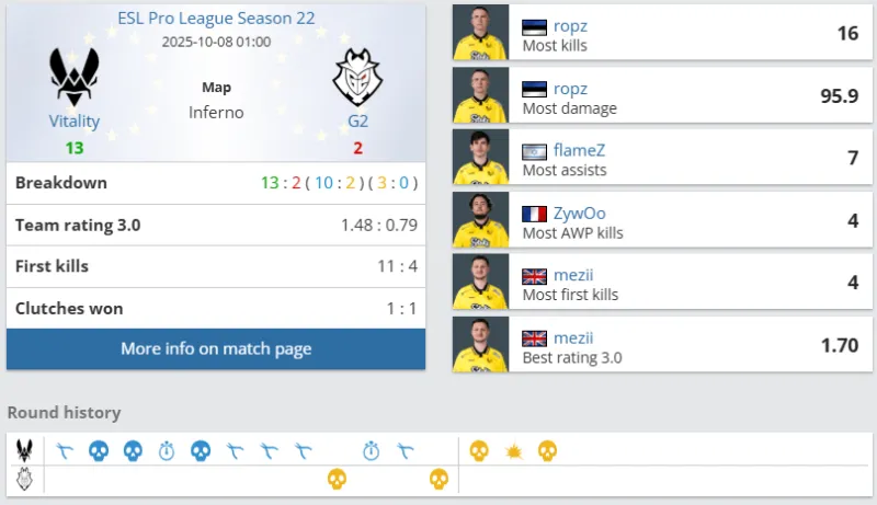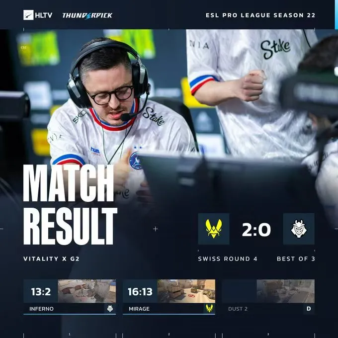 下半场易边再战。手枪局失利后,G2强起失败送出十个赛点。最终,图一Vitality 13-2 G2,碾压对手选图。大比分1-0,Vitality先下一城。