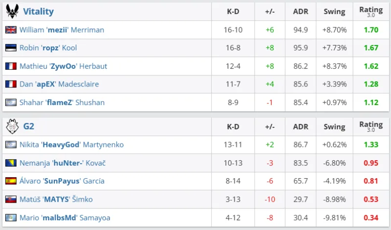 下半场易边再战。手枪局失利后,Vitality强起局ZywOo英雄AK双杀apex回防吹风机双杀,双人四杀Vitality完成翻盘。第十七局,G2爆弹A区Vitality反刷A二楼成功,flameZ双杀保住支点Vitality防守成功连续追分。第二十局,G2半起局提速B区,malbsMd绕后双杀帮助G2完成翻盘。凭借hunter与Sunpayus的双人五杀,G2拿到三个赛点。随后Vitality众将发力,连追三分进入加时。