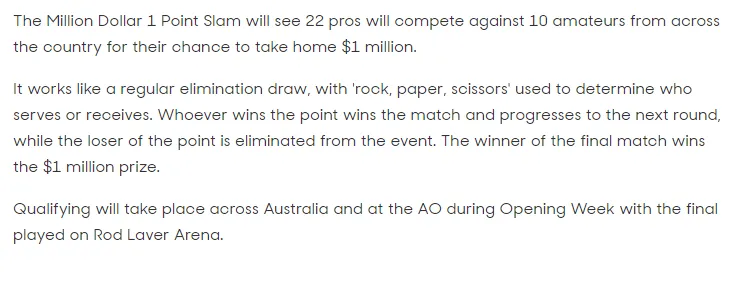 比赛采用单淘汰的赛制,两位选手将通过“剪刀石头布”的方式决定发球或者接发,然后打一分直接决胜负,赢家晋级输家淘汰,最终的冠军将带走100万澳元。