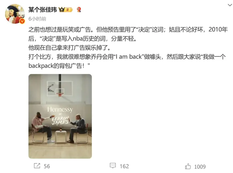 虎扑10月08日讯 昨日,勒布朗-詹姆斯的“决定”引起全网关注,但最终结果只是与知名白兰地品牌轩尼诗的合作广告。