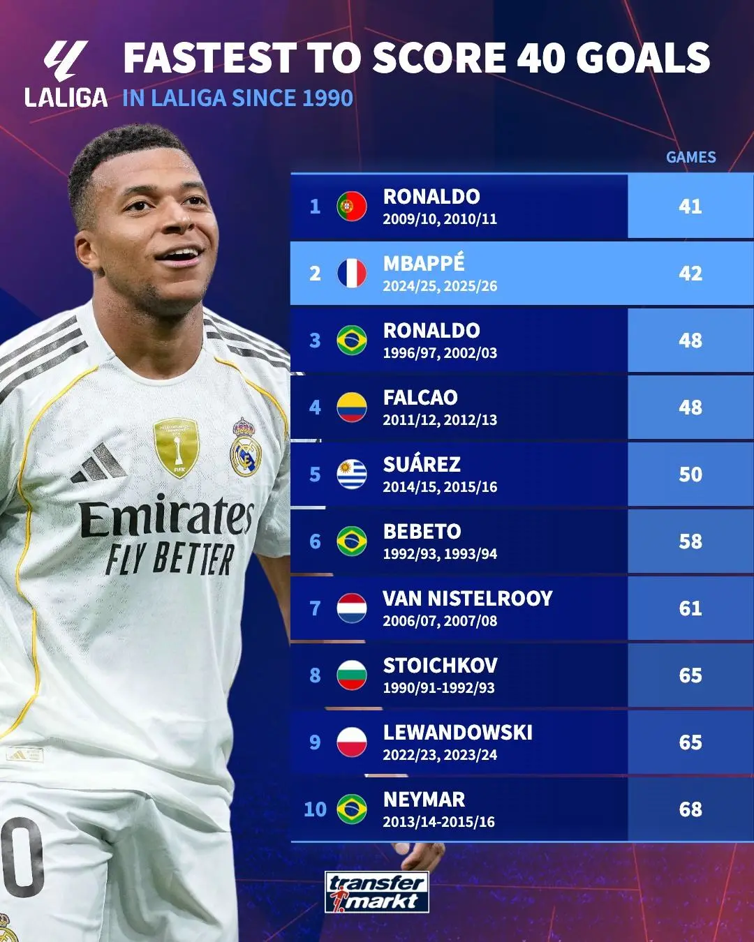 虎扑10月08日讯 德国转会市场盘点了1990年以来,最快达成西甲联赛40球的球员: