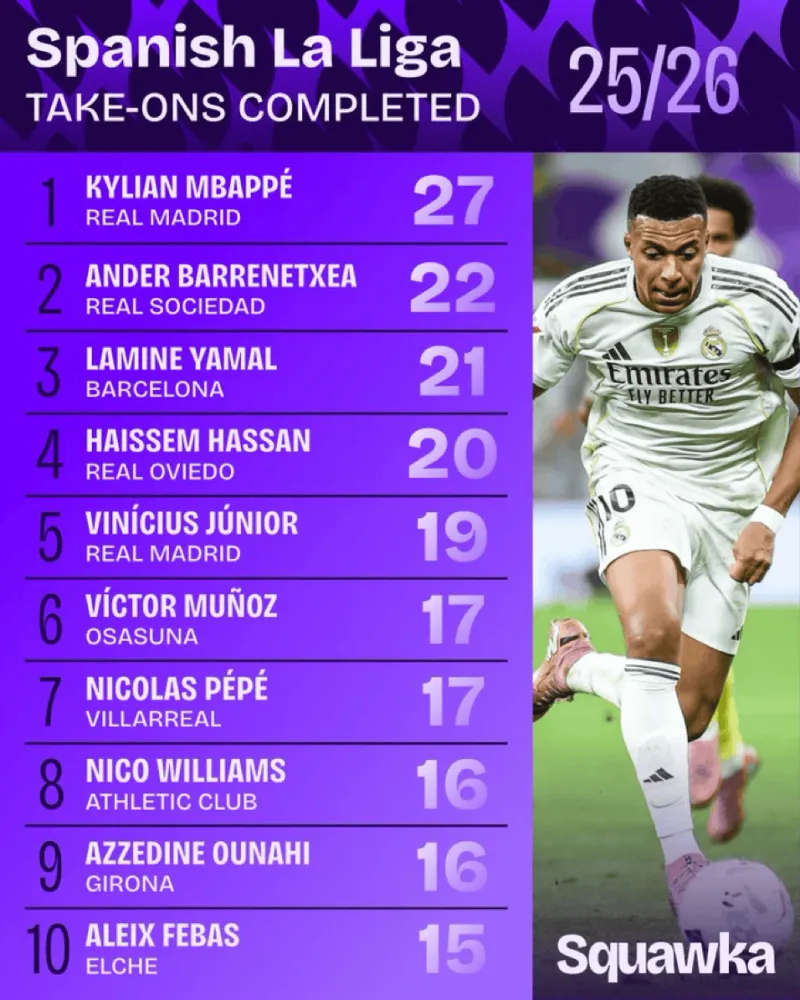 姆巴佩不仅进球数第1,成功过人也第1牛逼!