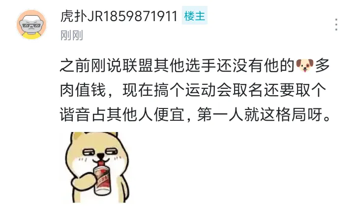 之前刚说联盟其他选手还没有他的🐶多肉值钱,现在搞个运动会取名还要取个谐音占其他人便宜,第一人就这格局呀。