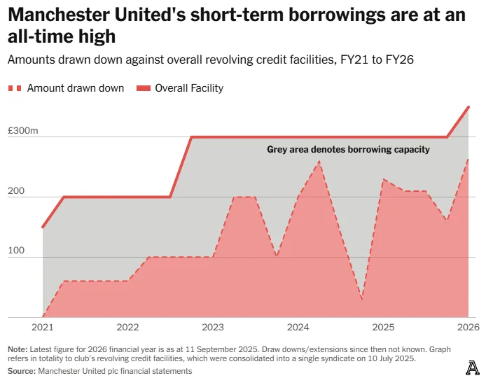 今年6月底,这一数字为6.37亿英镑,但此后的事件使其进一步上升。这些总计1.05亿英镑的信贷额度的支用,加上曼联6.5亿美元(按当前汇率计算为4.84亿英镑)的长期债务,使得目前估计的总债务超过了7.5亿英镑。