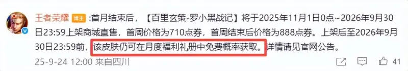根据规则,该皮肤上架礼册首月结束后,开启商城直售模式,但还是会保留在礼册中,可以免费抽取。
