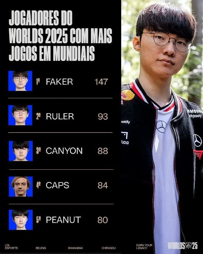 无论 T1 在本次赛事中取得怎样的成绩,Faker都将达成在《英雄联盟》全球总决赛舞台上出战 150 场的里程碑。