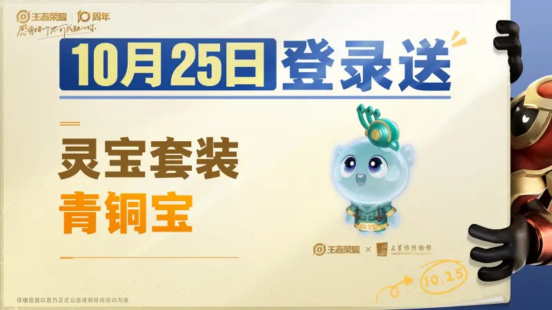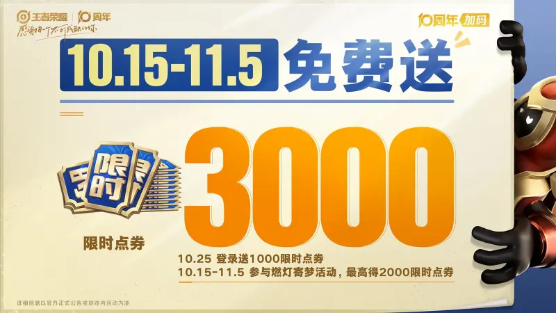 【10月25日十周年庆】小兵送上十周年福利预告省流版~送3000限时点券、积分夺宝30抽,10周年限定传说皮肤等丰厚福利~一定要记得,10.25 十周年庆,登录就能领福利哟!