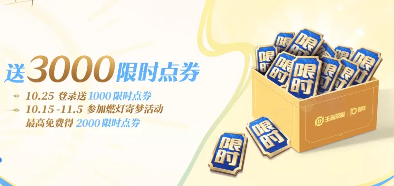 25日周年庆当天登陆,即可获赠1000限时点券,而后参加燃灯寄梦活动还能最高获得2000,相当于买个传说皮肤加个史诗皮肤还能剩一些,我只能说本次活动的福利绝对是空前的,3000点券相当于300元人民币,小王你真的舍得啊。