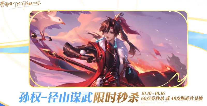孙权的伴生勇者也来了,该皮肤将于10月10日开启,60点券购买,或者48个皮肤碎片兑换,如今皮肤碎片的适用性大幅度提升,对于碎片不算多的玩家来说,60点券买其实也未尝不是一个好的选择。