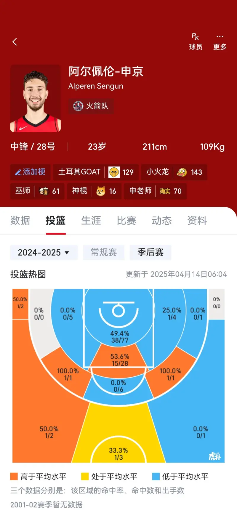 上赛季常规赛,申京出场76次,数据为19.1分10.3篮板4.9助攻1.1抢断0.8盖帽,投篮命中率49.6%,三分命中率23.3%。