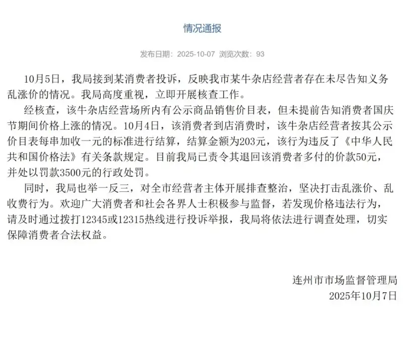 虎扑10月08日讯 10月7日,广东连州市市场监督管理局发布情况通报:10月5日,我局接到消费者投诉,反映我市某牛杂店存在未尽告知义务乱涨价的情况。我局高度重视,立即开展核查工作。