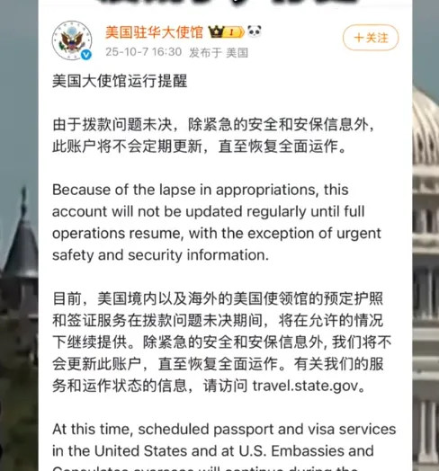 虎扑10月08日讯 10月7日,美国驻华大使馆官方微信和微博发布美国大使馆运行提醒:由于拨款问题未决,除紧急的安全和安保信息外,此账户将不会定期更新,直至恢复全面运作。