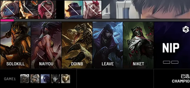 NIP选用:Solokill鳄鱼、naiyou皇子、Doinb阿卡丽、Leave亚飞、Niket烈娜塔
