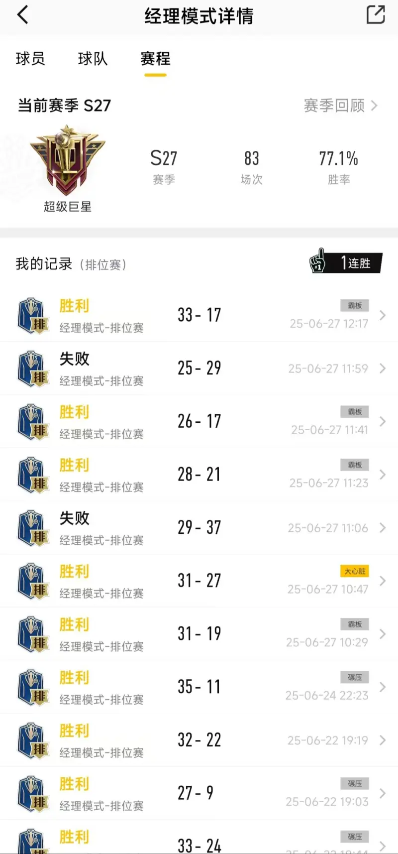 由于日常爱梭哈换球员,出林的时候,我倒不是奔着街头王朝强度,就是想着等梭哈换球员的过渡阶段,能保经理超巨段位,再也不用想着换大哥还得考虑是不是经理能射的球员,结果这赛季折腾了几百场,被打到了当家球星 ,虽然说是林书豪+一堆臭鱼烂虾球员吧,之前最难的时候基斯波特+比斯利+米罗也能到巨星,也许是现在经理更卷了吧?大家都会玩了?