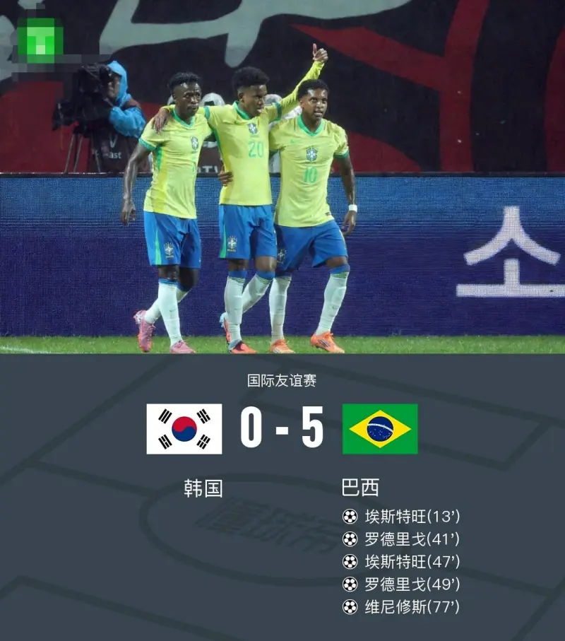 友谊赛巴西5:0大胜韩国,安切洛蒂将罗德里戈放在10号位,罗德里戈打进2球,切尔西小将埃斯特旺也打进2球。