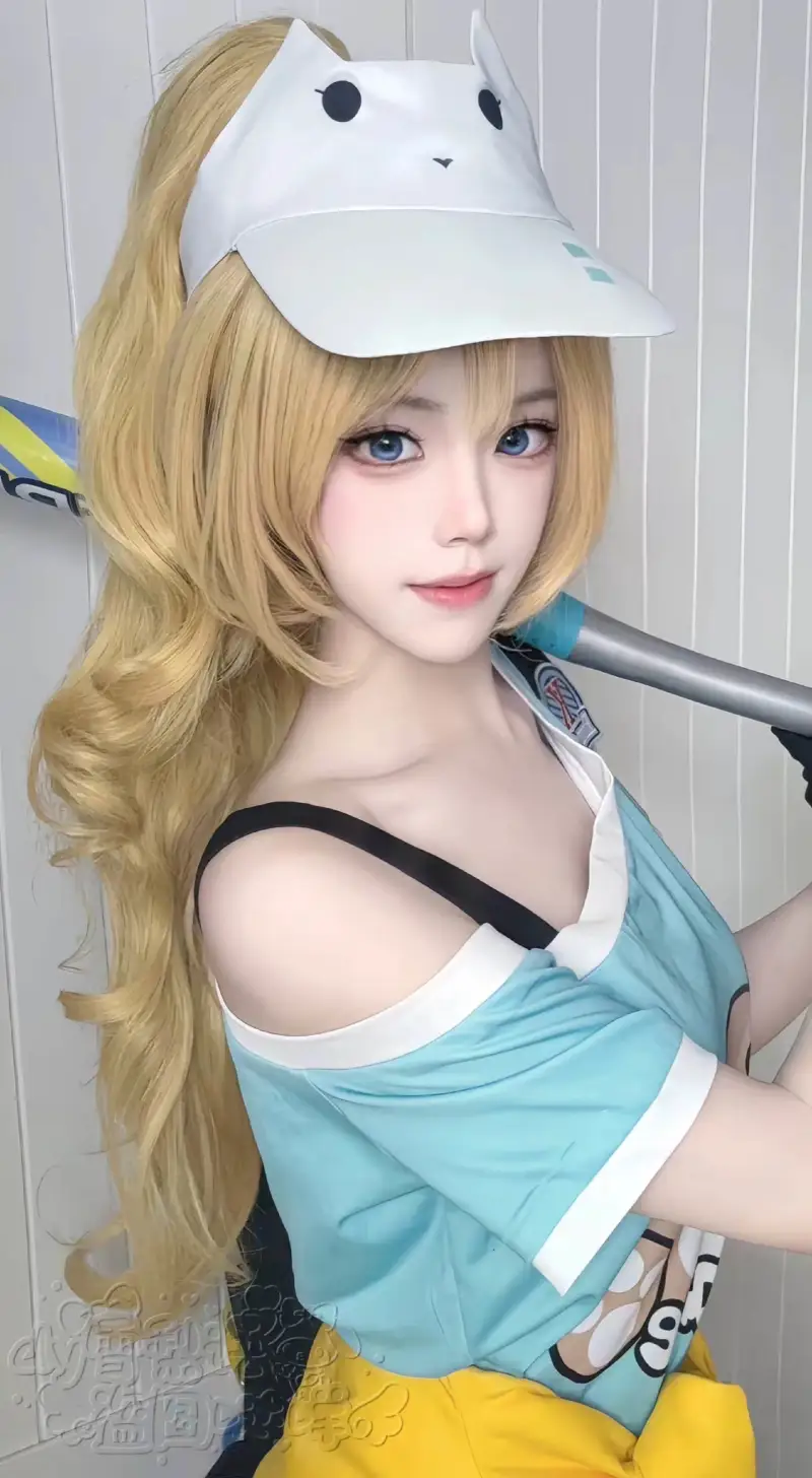 而且,为了更加的还原造型,她手中还拿着一个蓝色的棒球棒,也是很有青春气息的。并且,她衣服上的这个棕色小熊也很可爱,搭配卷头发的黄色高马尾,这个造型直接绝了。