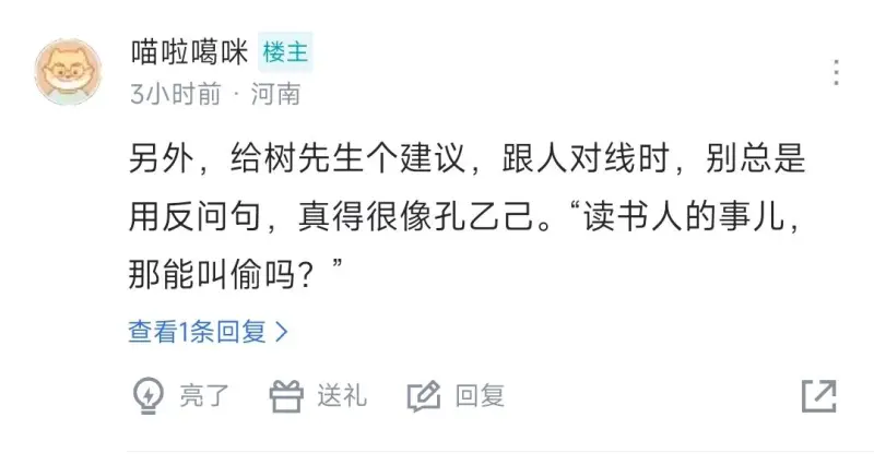 另外,给树先生个建议,跟人对线时,别总是用反问句,真得很像孔乙己。“读书人的事儿,那能叫偷吗?”