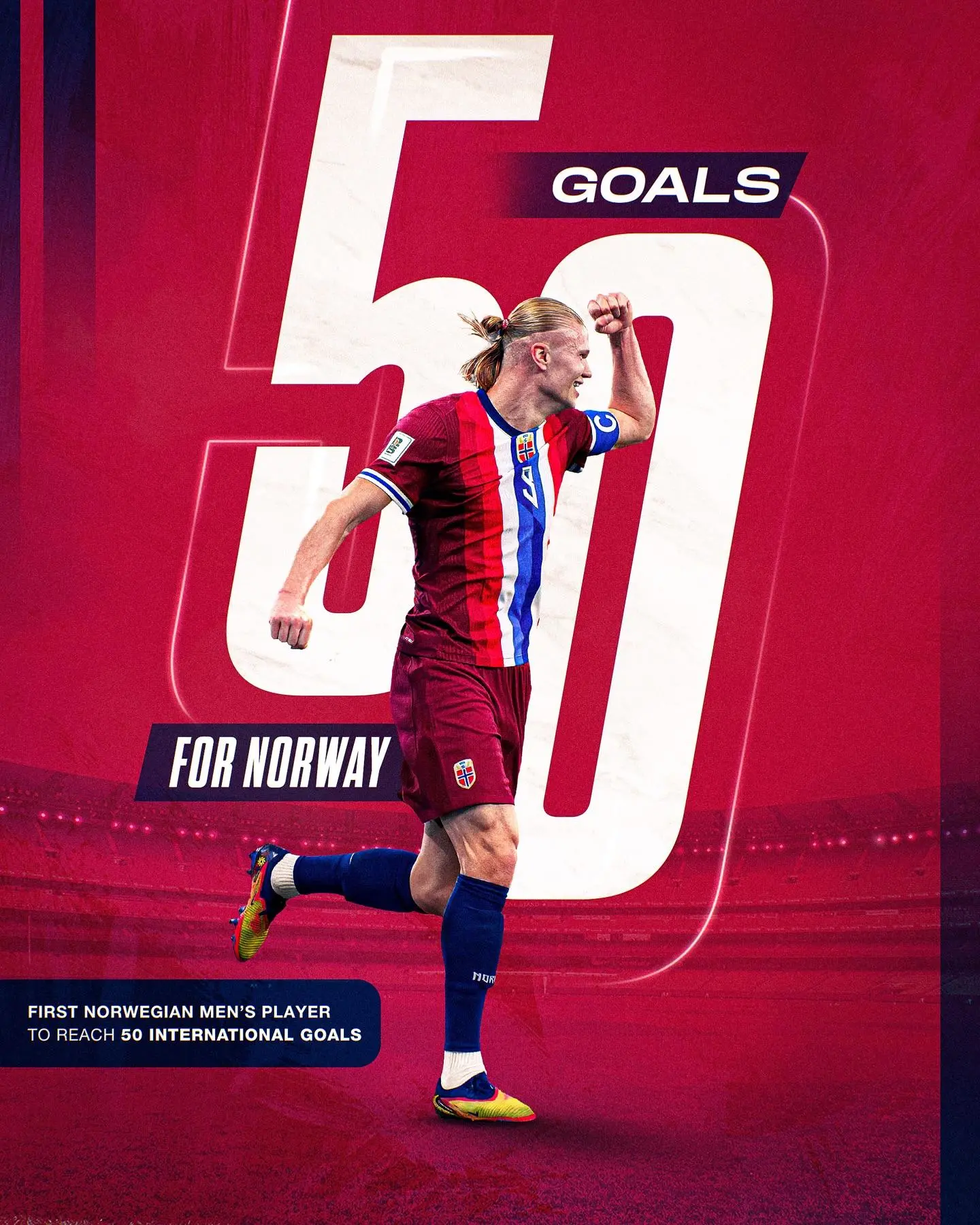 挪威前锋已经将国家队进球数刷新至50个,他更新了Instagram:“第50个进球很特别,但第51个进球让人感觉更好。🫡🇳🇴”