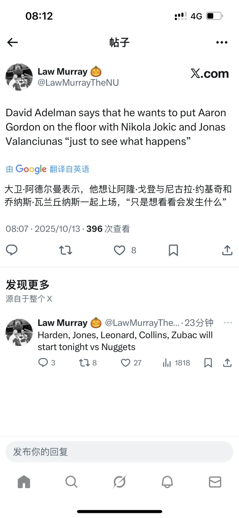 掘金队的首发五人将与上一场比赛相同:穆雷、布劳恩、约翰逊、沃特森、约基奇