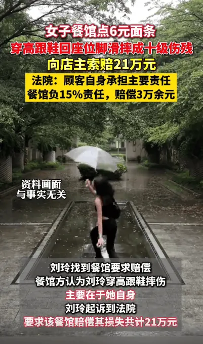 虎扑10月13日讯 顾客在餐馆点了一碗6元的面条,返回座位时穿着高跟鞋的她脚一滑摔成骨折。事后顾客起诉餐馆索赔21万元!法院会怎么判?