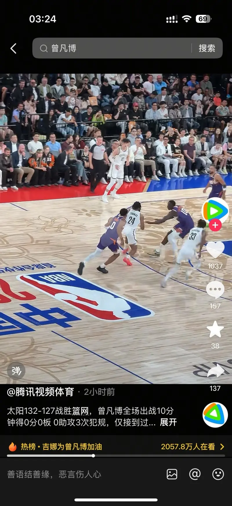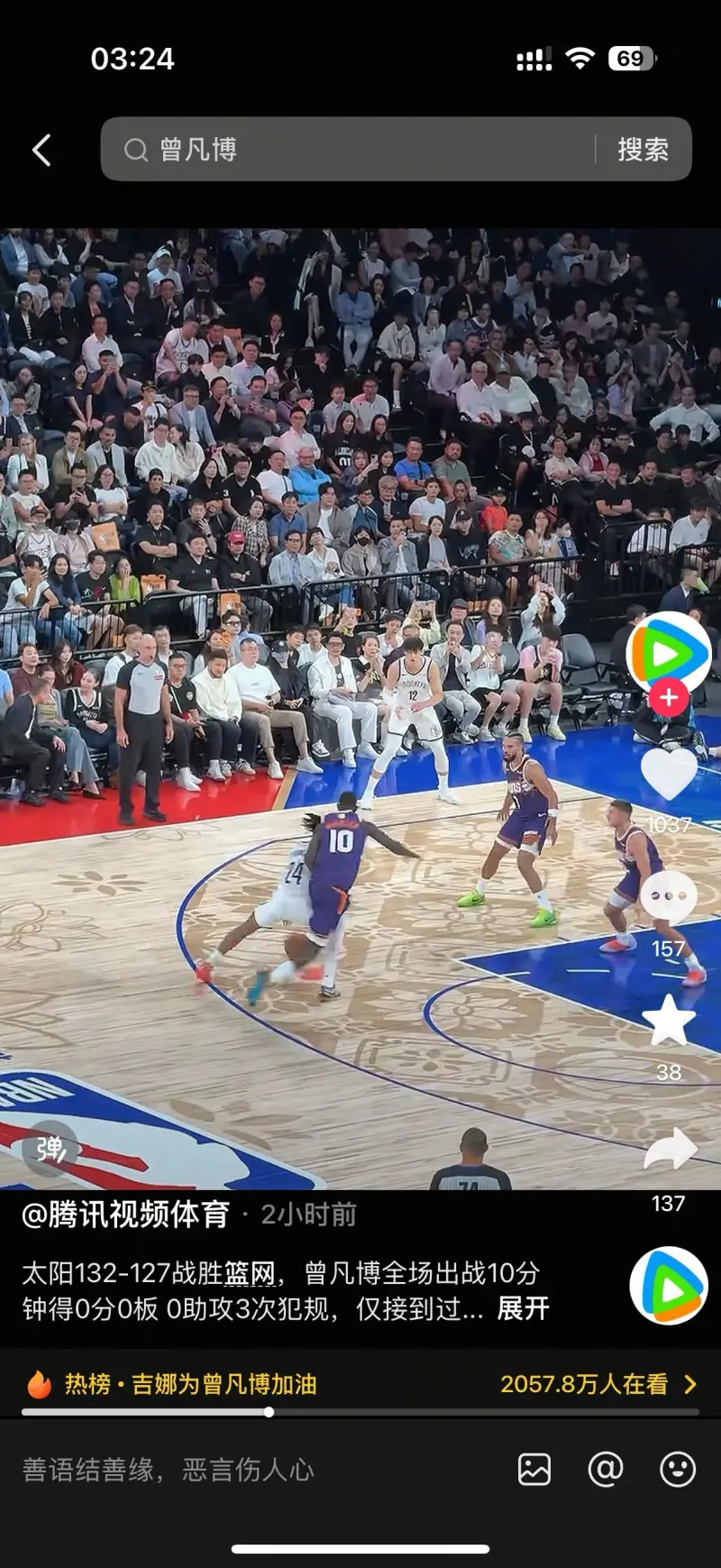 谈及加入到这支球队后体会,曾凡博表示:其实没有过多时间去想感受,因为其实很快,我从国内在医生评估过后能接受训练,再到篮网队一共不到三周时间,我在菲尼克斯康复了三周,就直接到了篮网报道,接着就开始融入体系开始打对抗,接受球队所有对我的评估和定制的计划。