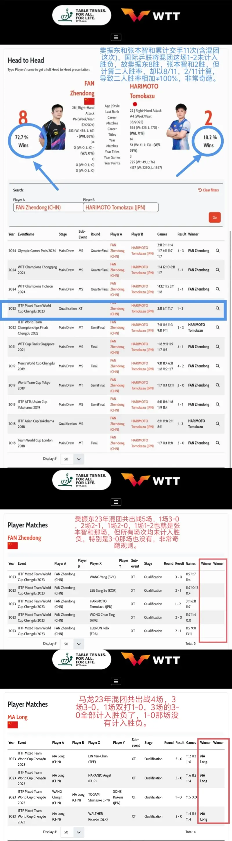 图四是樊振东23年混团的不合理统计方式,樊振东的几场单打,2:1不算赢,3:0不算赢,1:2不算输,而马龙的3:0却算了赢,1:0没算赢。这说明完全是国际乒联混团的统计方式有问题。(还有王楚钦、孙颖莎也是和樊振东一样,赢了不算赢,输了不算输的问题,有兴趣的可以去查查)!