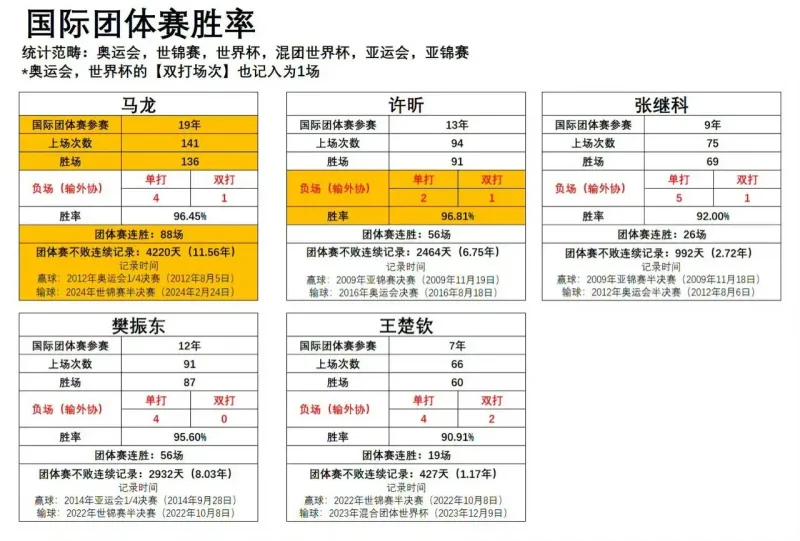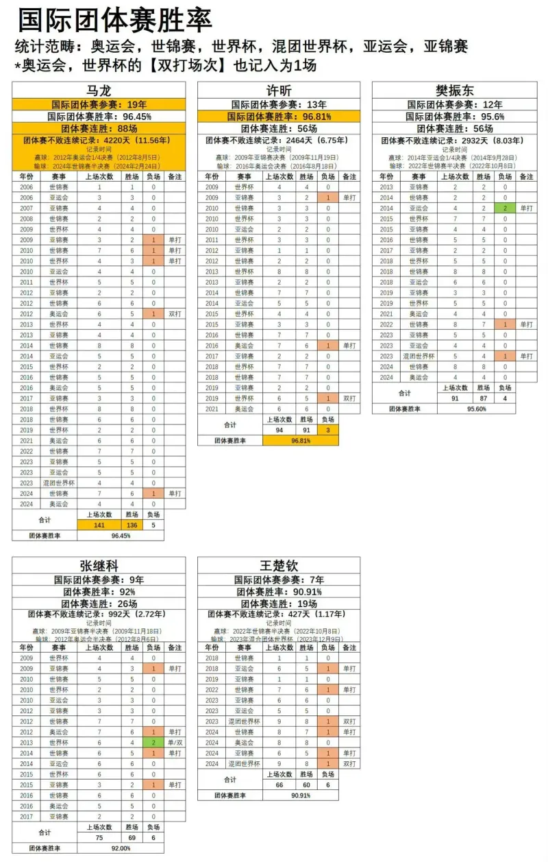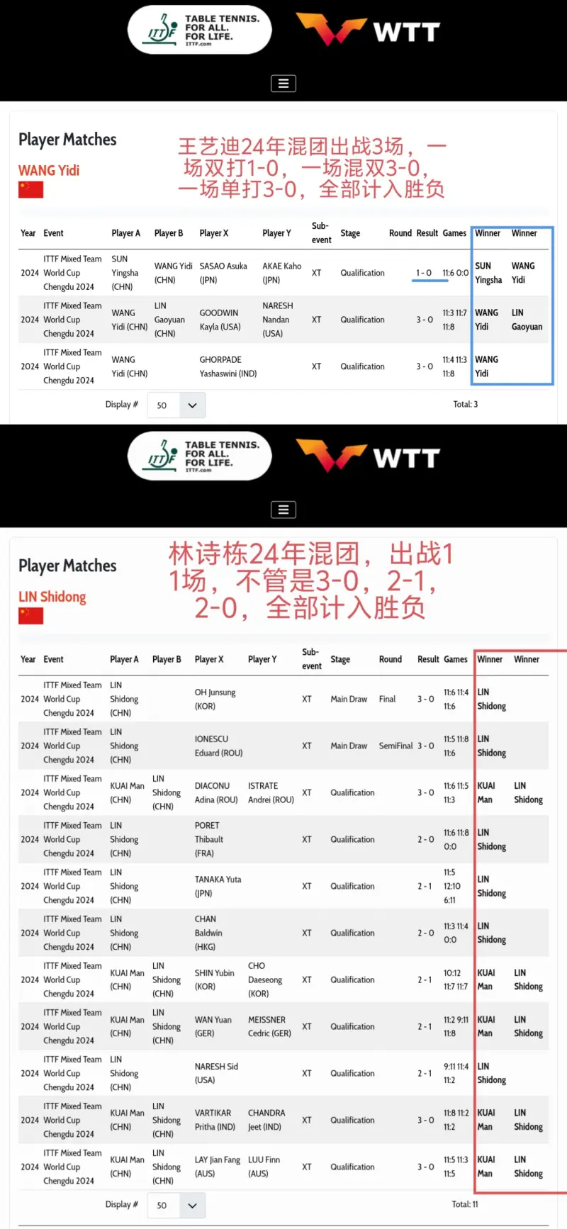 图五是24年混团的统计方式,林诗栋、王艺迪不管是3:0,2:1,2:0,1:0全部按规则计算了胜负,这才是合理的统计方式。(其他人也是24年这种统计方式,有兴趣的可以去看看。)