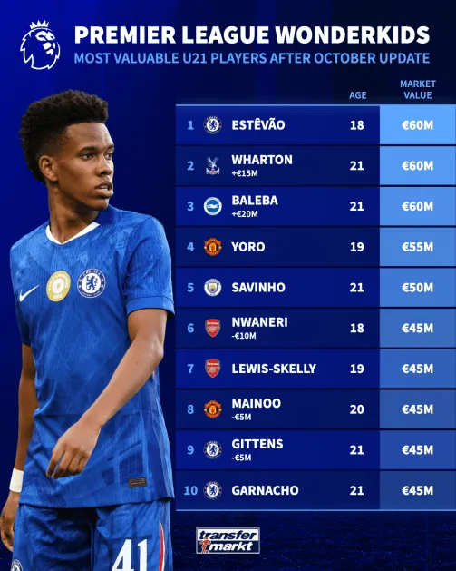 虎扑10月18日讯 在英超球员身价更新后,德转(Transfermarkt)也同步盘点了目前英超联赛U21球员的最新身价排名。