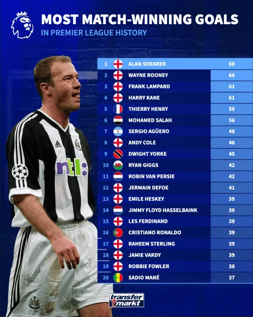 虎扑10月18日讯 德转公布了英超历史“制胜进球榜”,统计了英超球员英超生涯中直接决定比赛胜负的进球数量。