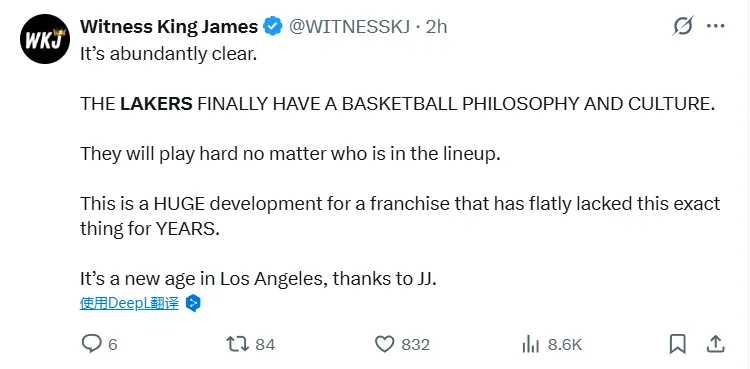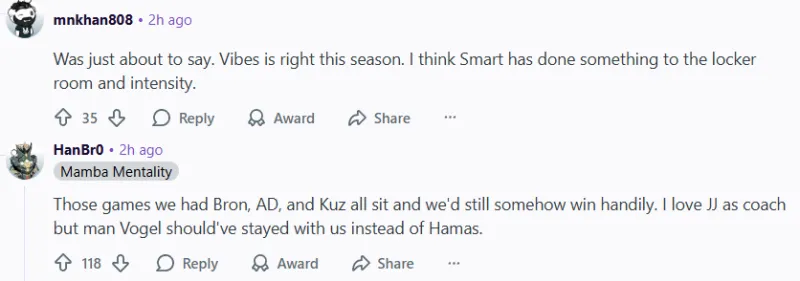 -(118赞)在那些比赛中,我们让勒布朗、AD 和库兹马都坐在场下,但我们还是会以某种方式轻松获胜。我喜欢JJ作为教练,但沃格尔应该留在我们这里,而不是哈姆。