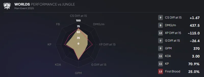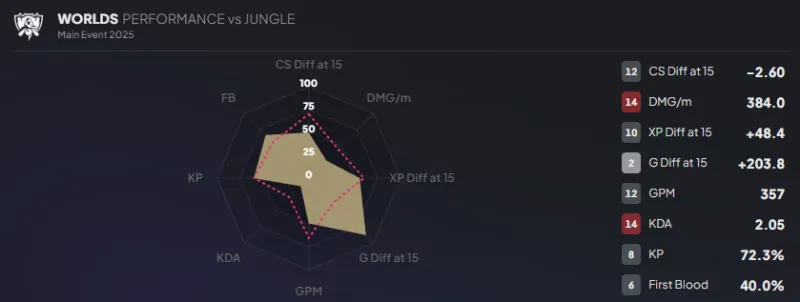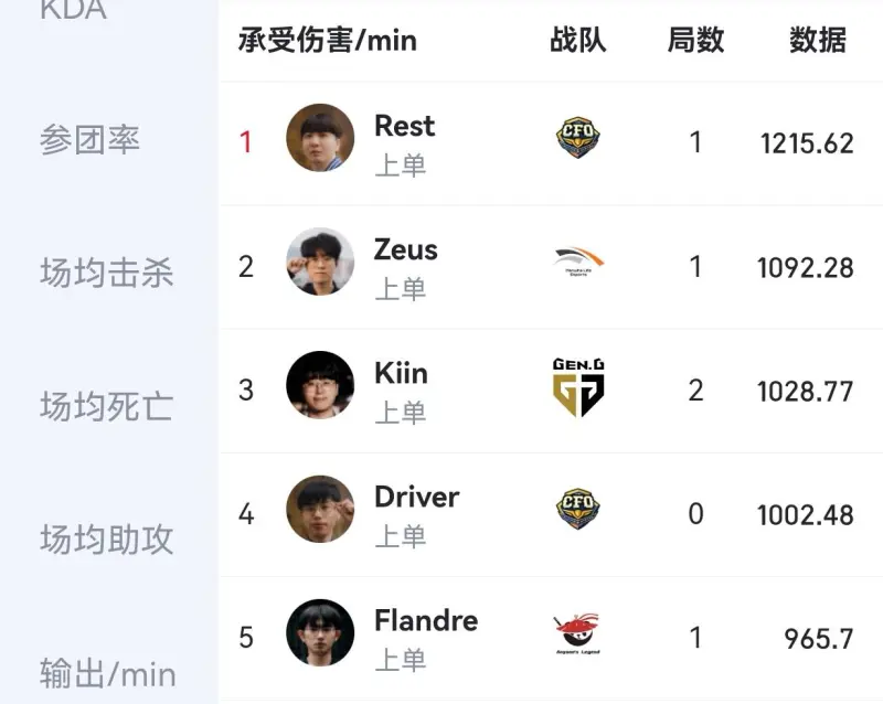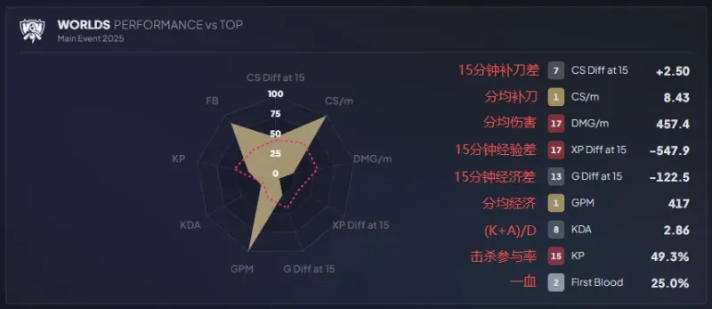 十五分钟对位、场均伤害和经济、一血率均倒数
