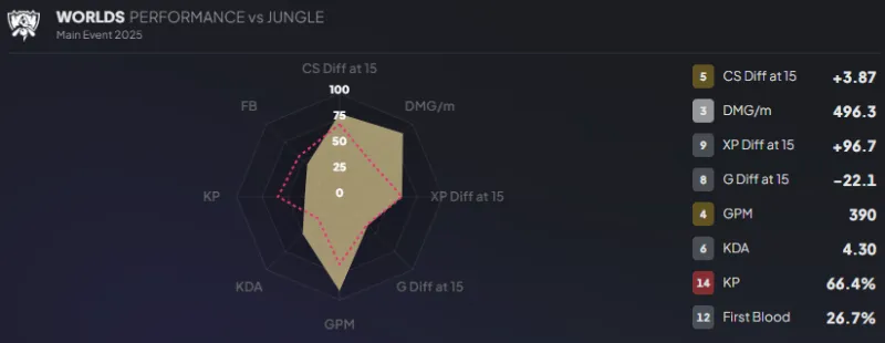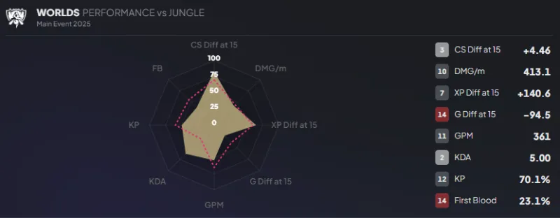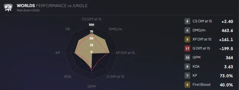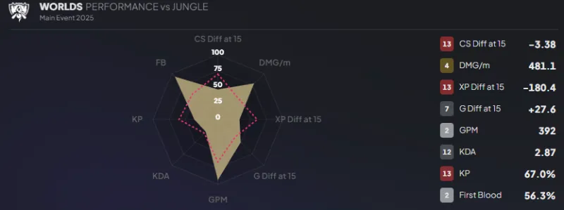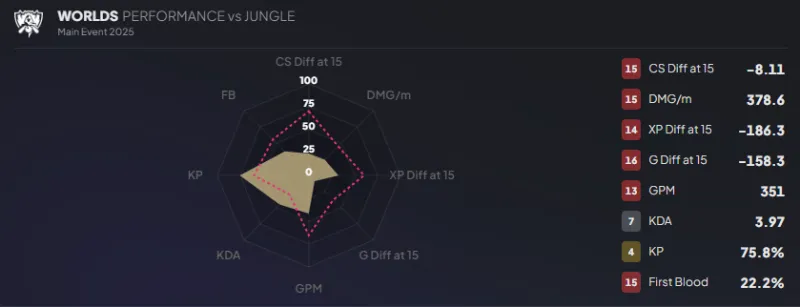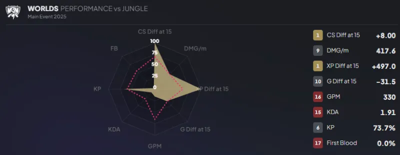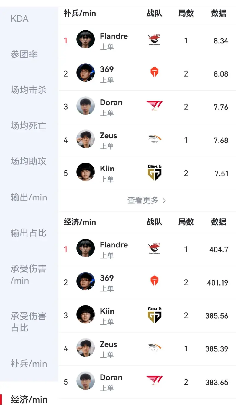 十五分钟补刀差倒数的情况下,有趣的是对位对位经济差是中上等水平,同时一血率高居第二,也就是说前期更多是靠人头经济起节奏?