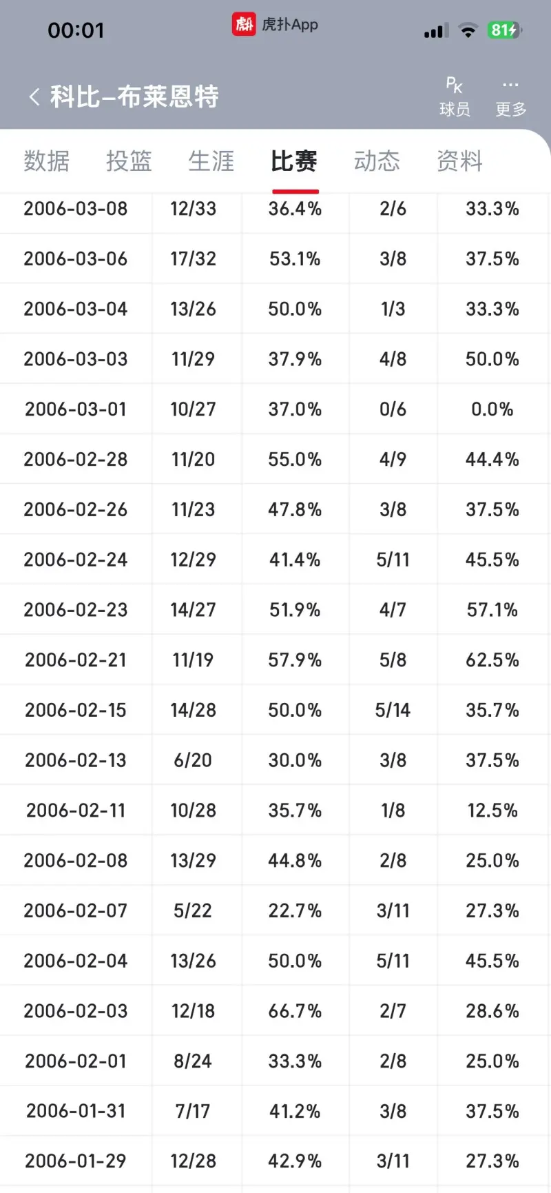 06年不算生涯末期吧,随机看20场比赛,有8场50命中率以上,5场40命中率以上,6场30命中率以上,1场20命中率以上,至于我也什么选择06年,主要是因为前段时间压力26罚50多分的时候,有人说只要给20以上的罚球都能拿50多分,而06年1月底那场比赛科比26罚23中得了40分