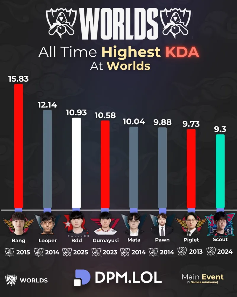 虎扑11月04日讯 外媒统计世界赛最高KDA: