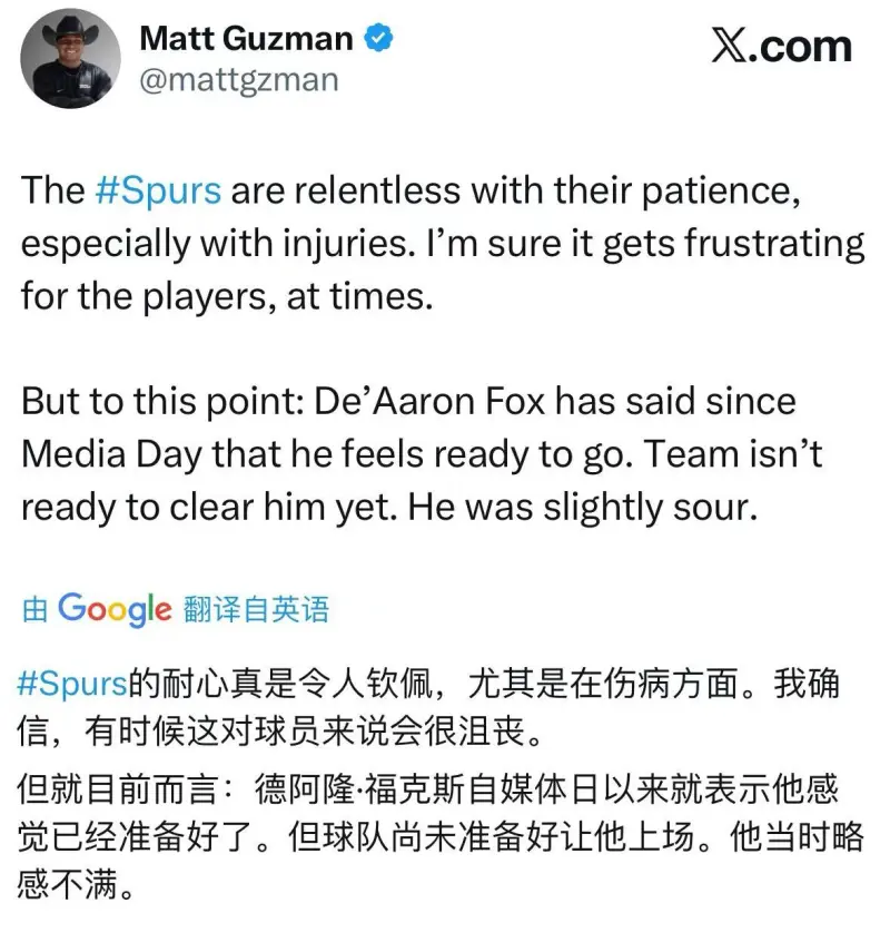 虎扑11月05日讯 马刺记者Jared Weiss更新社媒,公布了马刺的伤病报告情况。