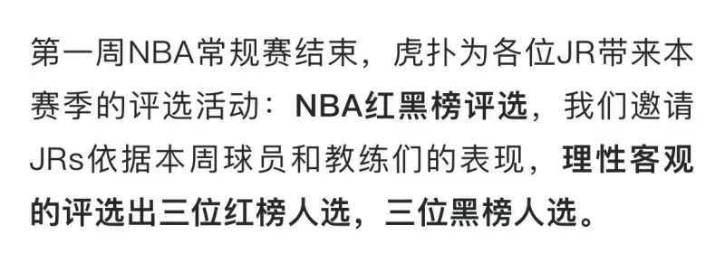 第一周NBA常规赛结束,虎扑为各位JR带来本赛季的评选活动:NBA红黑榜评选,我们邀请JRs依据本周球员和教练们的表现,理性客观的评选出三位红榜人选,三位黑榜人选。