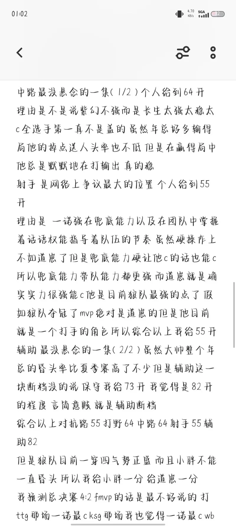 一诺打道崽纸面64开预测决赛55开,道崽这个数据太吓人了(当然最大的原因是完美避开ag),守约的独立英雄池,艾琳戈雅发挥都不错,公孙离鲁班不太行这俩和孙权老夫子什么的不知道会不会藏一手,一诺的重要性在去年年总小俞上场被连追三局就已经证明了'不要再优势的时候做无意义的事情'队友上头他是可以止住的,但是小胖上头道崽没有这个能力呵止